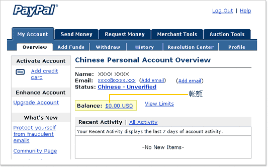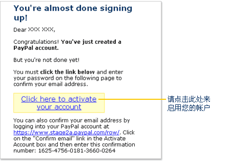 请选择您的市场以及您将要启用的帐户类型,然后点击“继续”按钮。 输入个人信息 请输入您在信用卡或银行帐户中列出的姓名和地址(注册时只能输入英语字符,并且不能包含重音字符)。主要币种是指您希望用来发送和接收大部分付款的货币。 ![]() 输入电子邮件地址和密码 电子邮件地址在您登录 PayPal 帐户时使用。您的密码必须至少为 8 个字符长并应区分大小写。请尽量使您的密码与众不同。我们强烈建议您使用一个全新的密码,而不要使用其他非 PayPal 帐户使用的密码。 ![]() 安全问题 - 如果您忘记了密码,我们可以使用您为安全问题提供的答案来认证您的身份。请选择两个不同的问题。 ![]() 高级帐户 高级帐户可以访问高级功能并能够以很低的费用接收所有付款,包括信用卡付款。发送付款完全免费! 《用户协议》和《隐私权政策》 注册 PayPal 帐户必须完成此步骤。《用户协议》和《隐私权政策》旨在保护和告知您在 PayPal 服务中享有的权利。 安全措施 注册 PayPal 帐户必须完成此步骤。请输入下框中显示的字符。这将会进一步提高您的帐户和 PayPal 网络的安全性。这并非您的密码。 ![]() 注册过程完成之后,PayPal 将会向您在注册阶段输入的地址发送一封电子邮件,此邮件会引导您进入一个可以确认帐户注册的链接。 ![]() 如果您选择了“点击这里启用您的帐户”链接,就会转到一个必须输入密码的页面。 ![]() 输入密码后,您就能访问自己的 PayPal 帐户了。 ![]() |