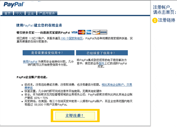 要注册 PayPal 帐户,您需要前往以下站点:www.paypal.com 并按照下面步骤进行操作。 ![]() 点击了链接后,就会出现以下页面: ![]() 选择正确的帐户类型 如果您只想使用 PayPal 发送付款,您需要注册个人帐户,它可以让您向任何有电子邮件地址的人发送付款。